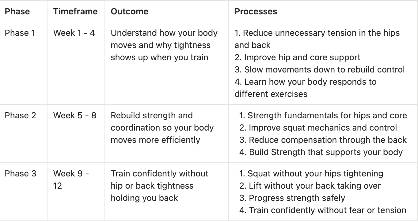 Your Strong and Supported program runs for 12 weeks and takes you through three progressive phases designed to help you squat and lift free from hip or back tightness.Â